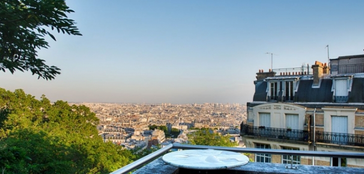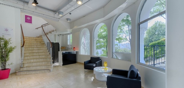 La salle de travail dont il dispose offre une vue panoramique sur toute la ville de Paris, et les baies vitrées qui l'entourent en font un espace très lumineux.
